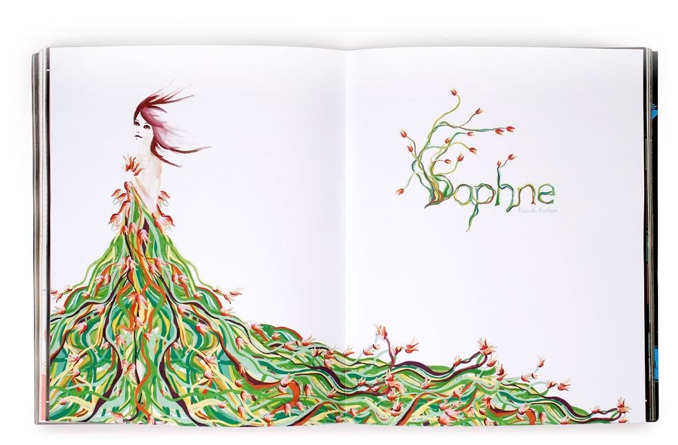 Daphne is a perfume that fuses natural radiance with feminine allure. ...So in order to communicate these specific qualities, I chose to reference the Greek myth of a beautiful, young woman who was transformed into a laurel tree by the gods... as a metaphor of sorts.